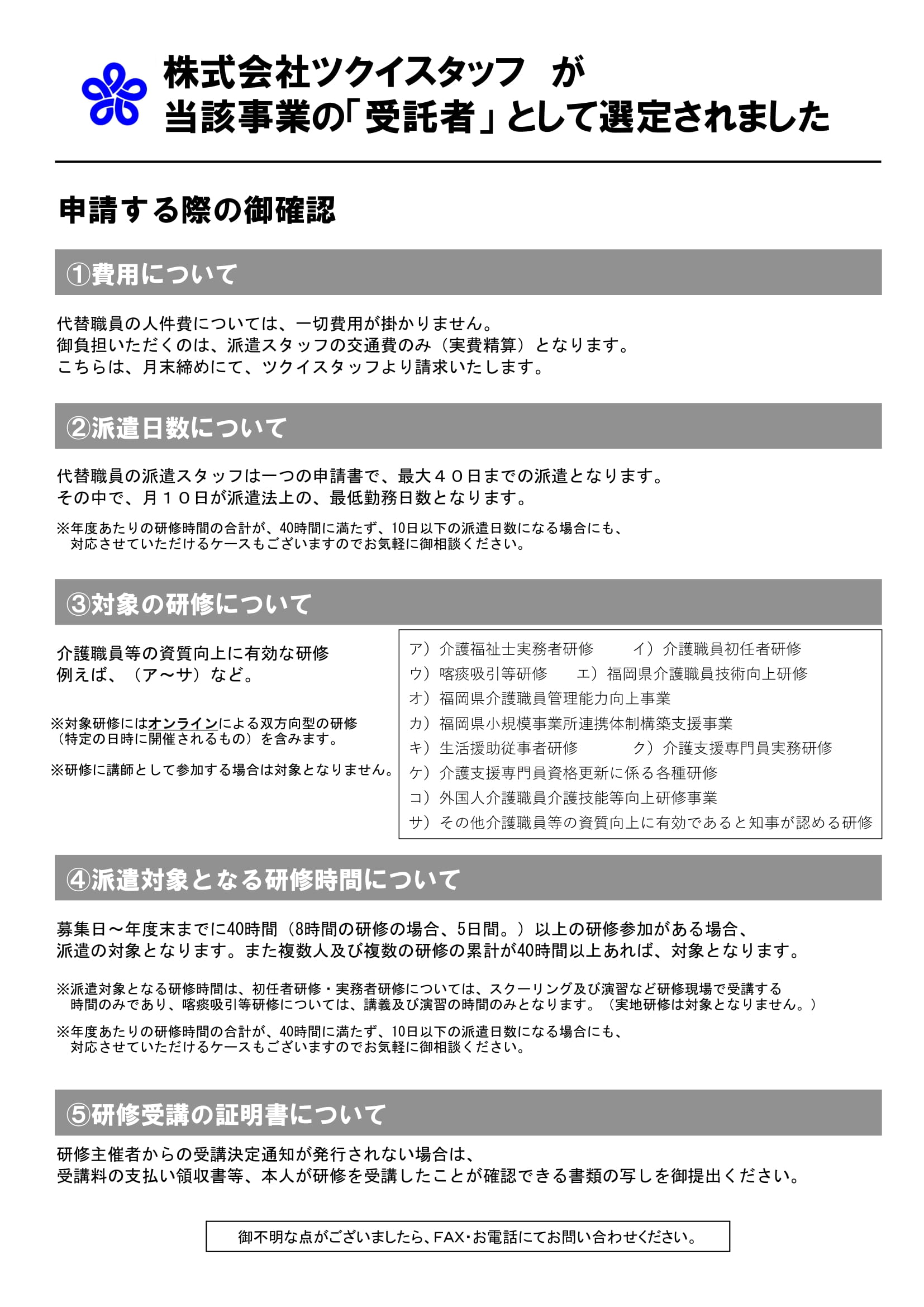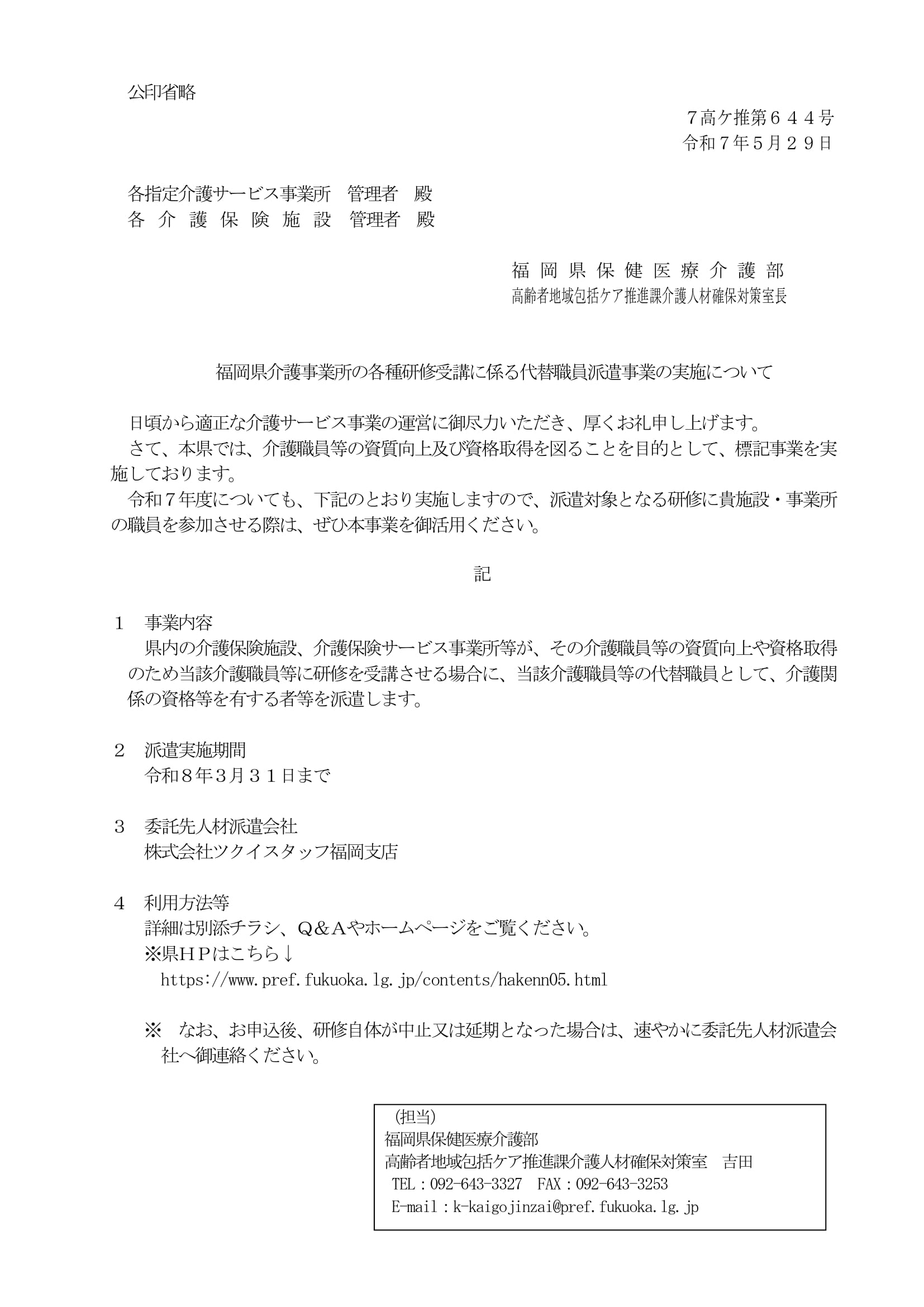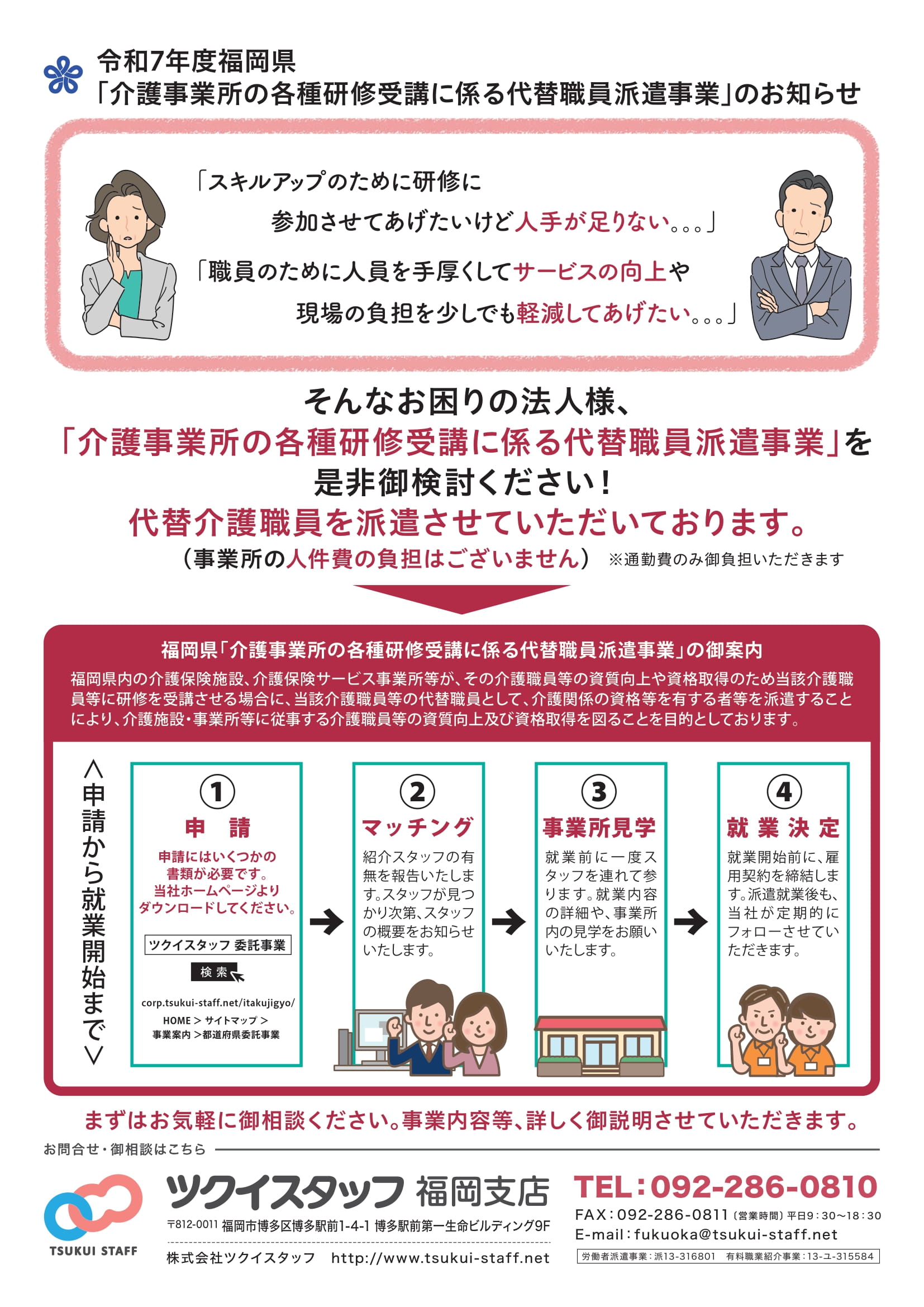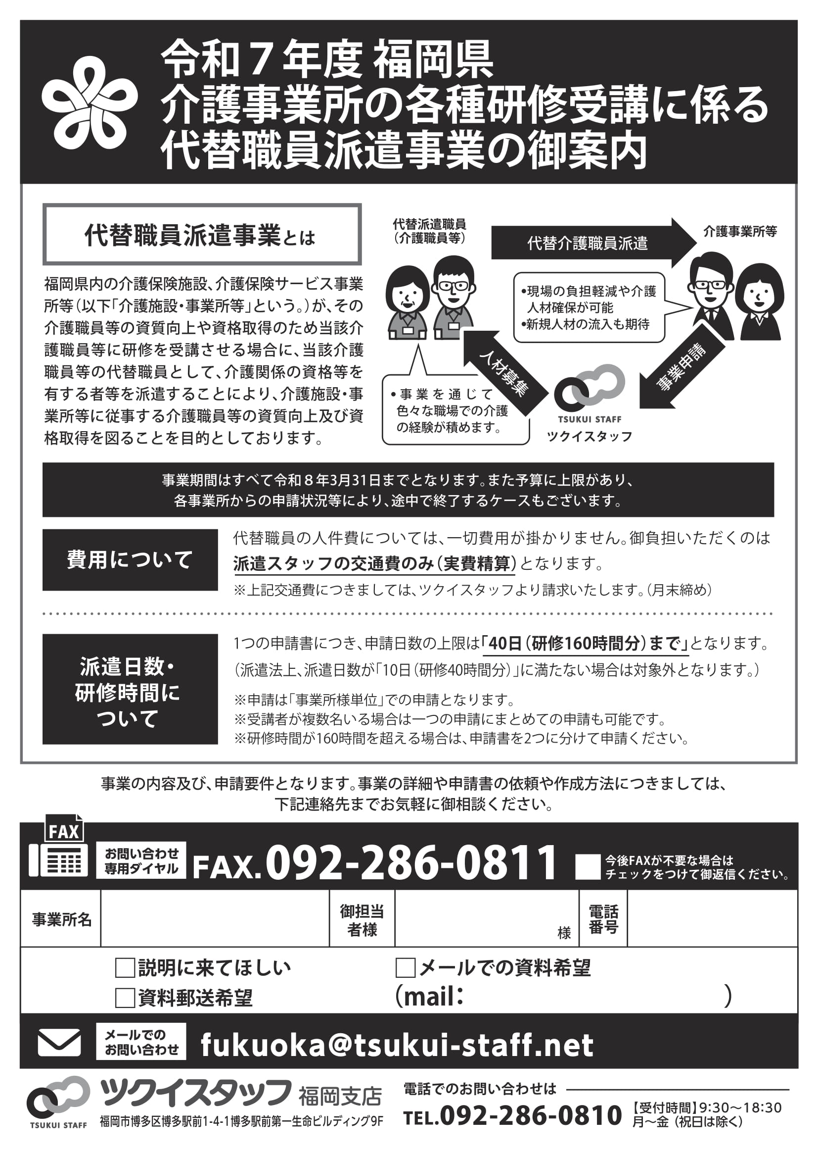 チラシはこちらから「その他」タブへ(外部)福岡県介護事業所の各種研修受講に係る代替職員派遣事業の実施について 2025.06.16
